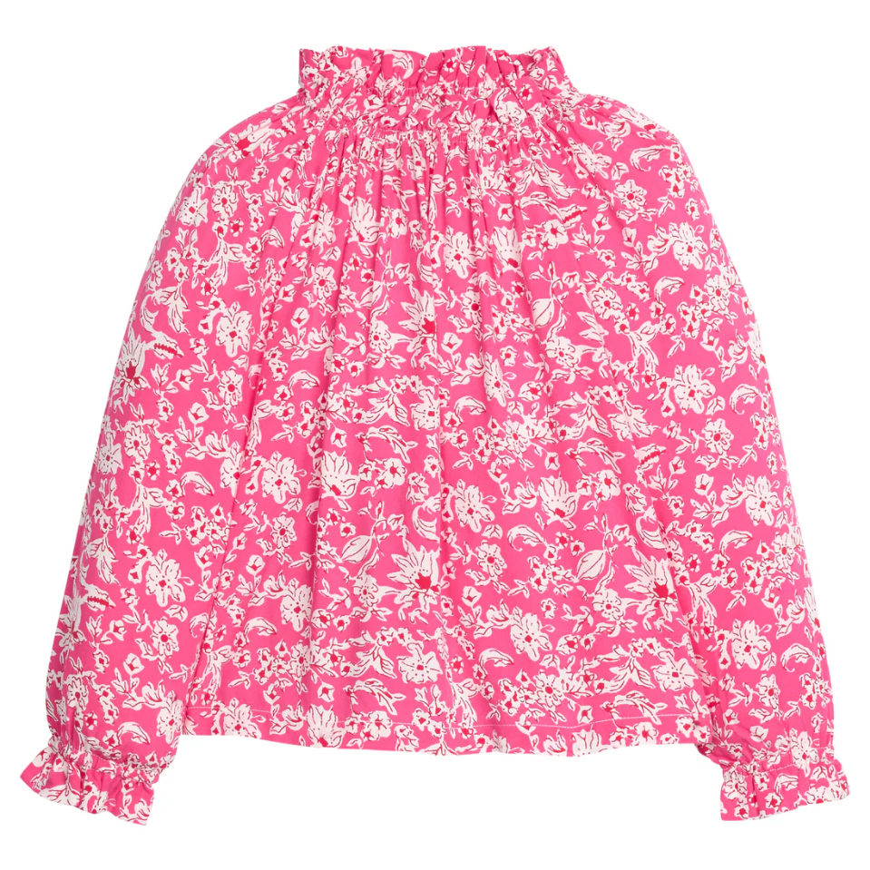 This Tory Top is lightweight and crisp, perfect for Fall days. The ruffled neckline and sleeves add a touch of playfulness to this gorgeous garment. This hot pink print on your #bisbygirl will be sure to make heads turn!