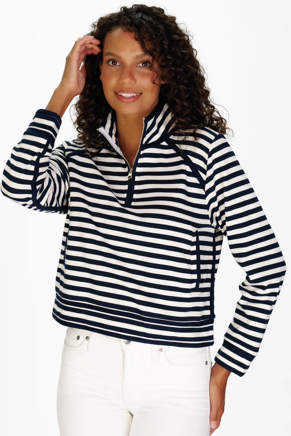 The women's Laine Quarter Zip is a refined, sporty essential that combines effortless style with all-day comfort. Crafted from Duffield Lane’s signature French terry fabric, this lightweight and soft quarter-zip pullover is perfect for casual layering, weekend outings, or travel. Contrast piping, a stand collar, and a navy-and-white stripe pattern give it a polished, put-together look, while the relaxed silhouette ensures ease of movement and comfort.