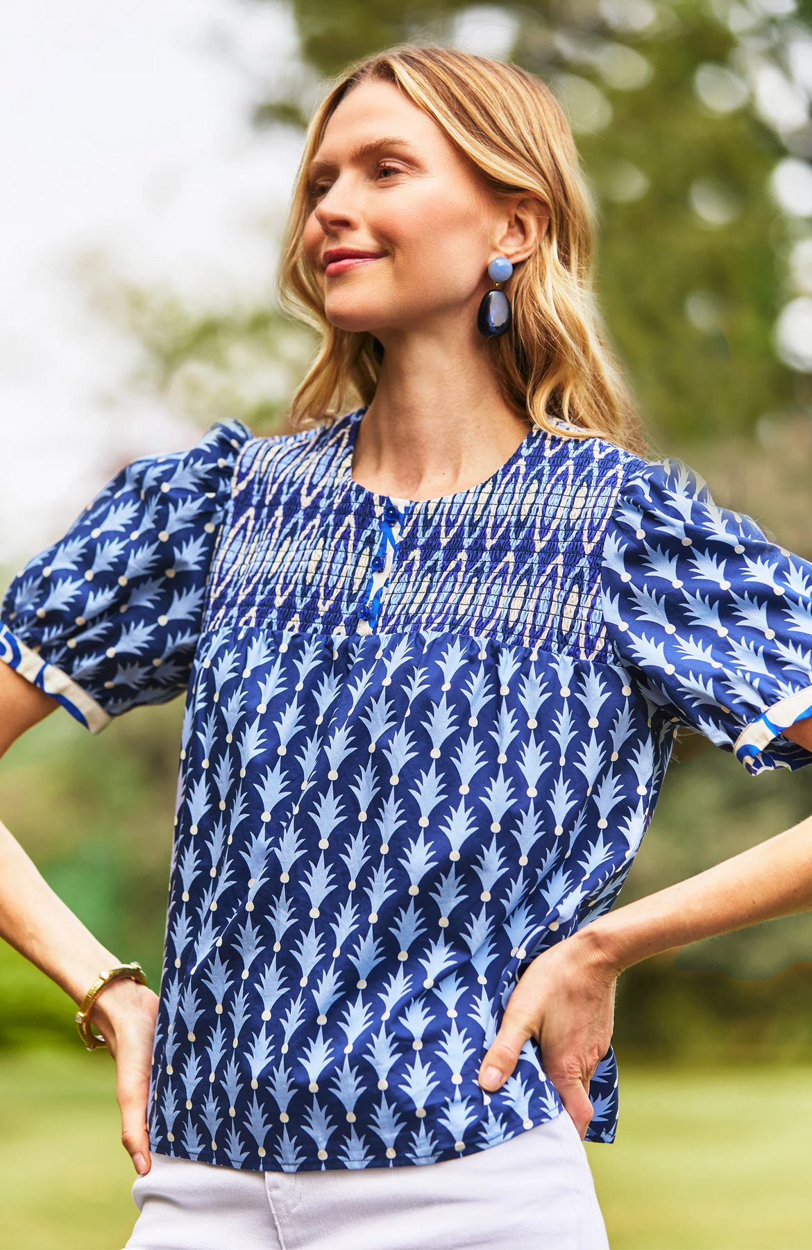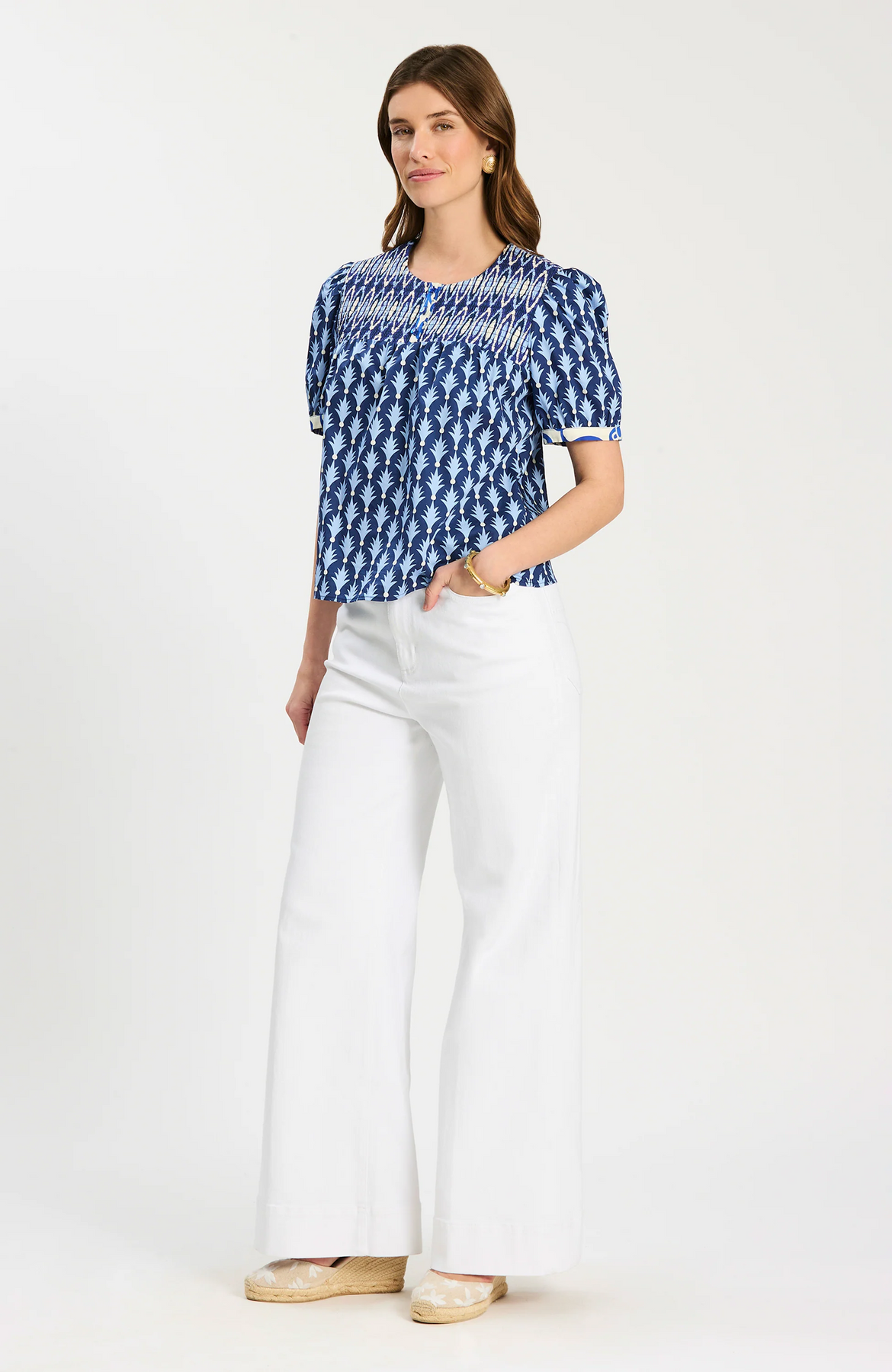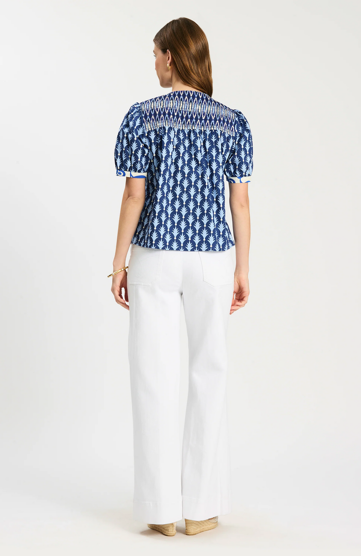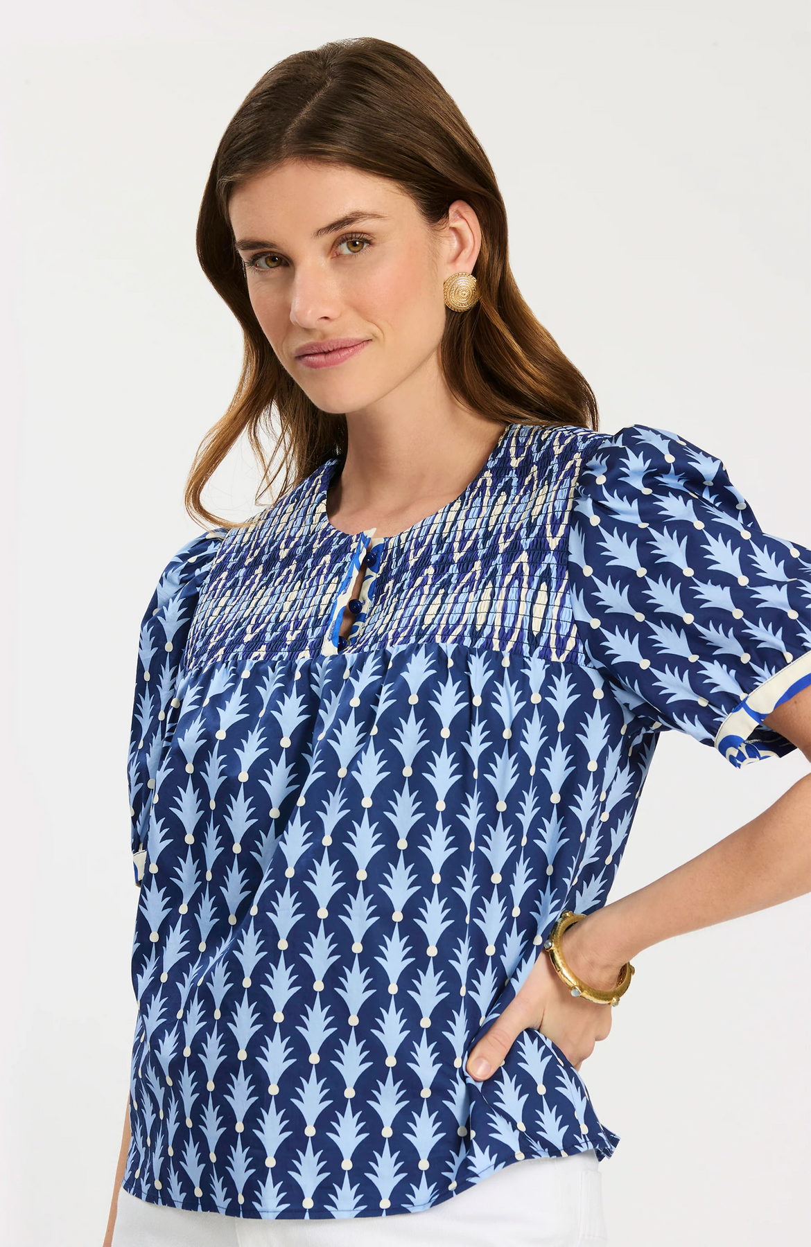 A refined take on an everyday top. This short-sleeve blouse features an intricate blue-and-white print with delicate smocking at the neckline, adding texture and a softly feminine feel. The silhouette is easy yet polished, making it a versatile piece you’ll reach for all season long. Perfect for workdays, weekends, and travel, this top pairs effortlessly with crisp white denim.