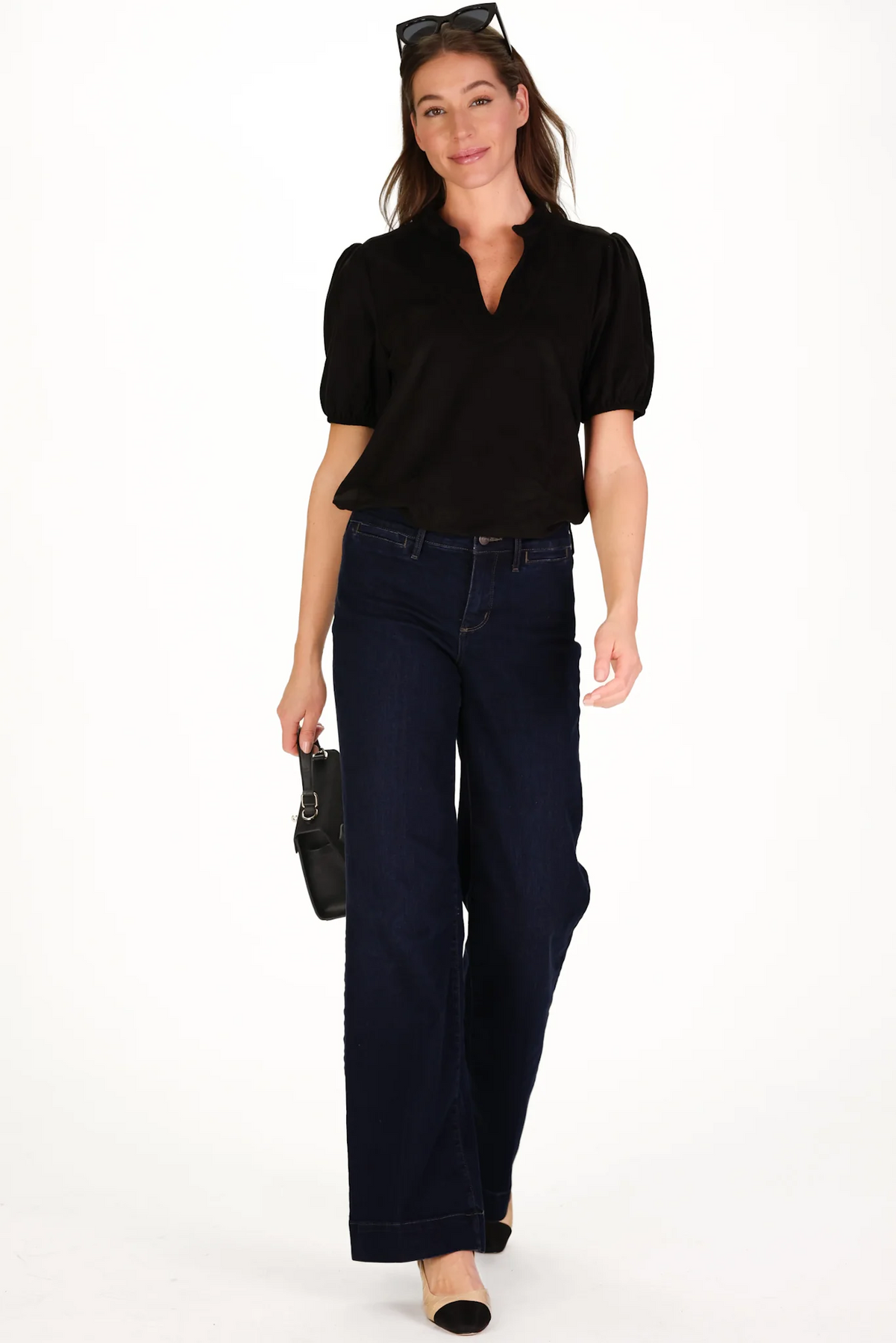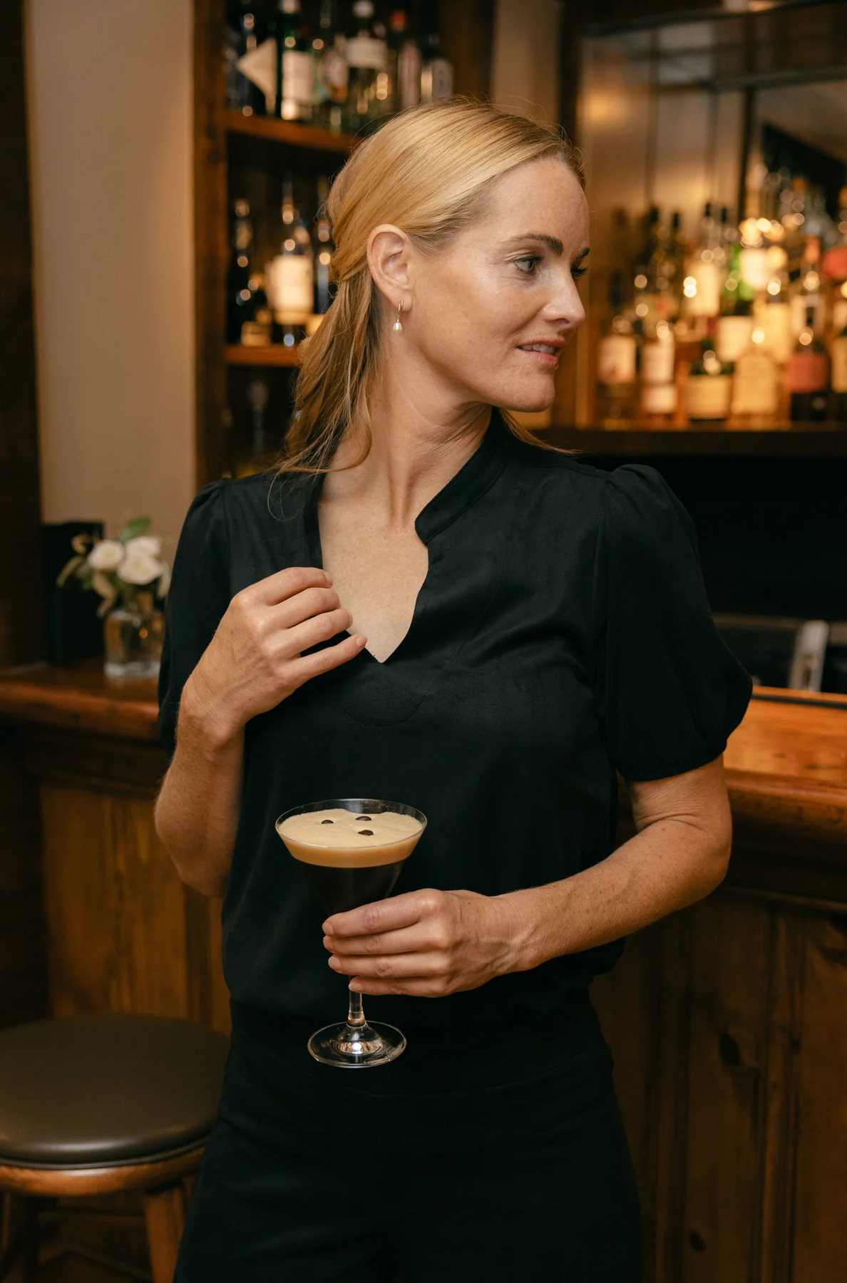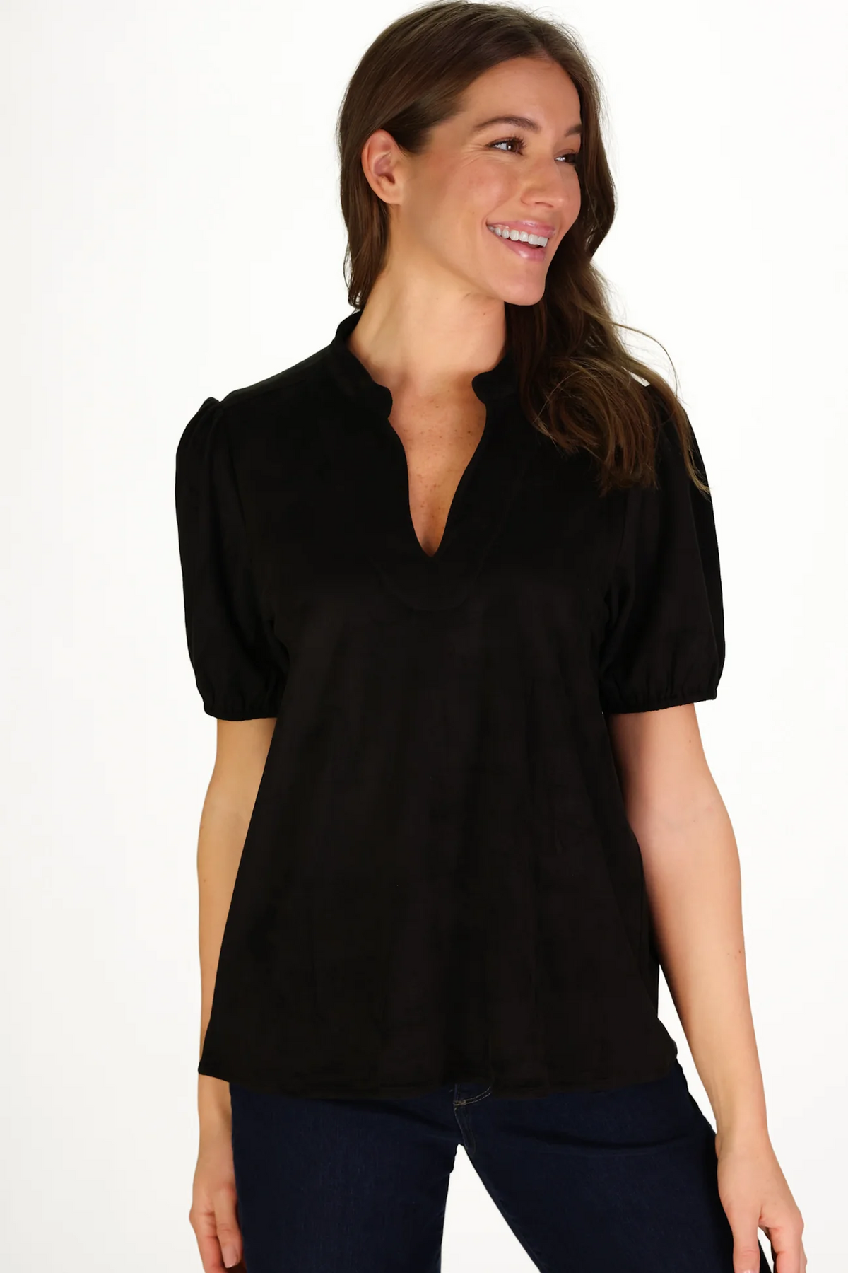This elegant top is perfect for the autumn season. Crafted from our soft, StretchSuede fabric, it features a flattering V-neckline and gently puffed sleeves that add a touch of femininity. This versatile staple can be dressed up or down. Pair it with our Suede Sasha Pant for an effortlessly polished yet incredibly comfortable look.