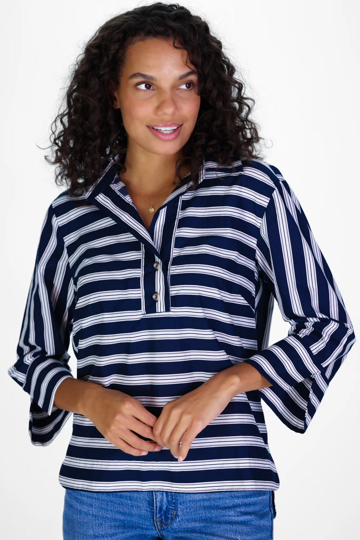 This fall top is the definition of effortless sophistication. With crisp stripes in a rich navy and tan palette, it's a timeless look you can dress up or down. Crafted from ultra soft fabric, this stripe top will be your go-to for seasons to come. Simply put, this navy top with collar detailing is a must for the modern woman's closet.