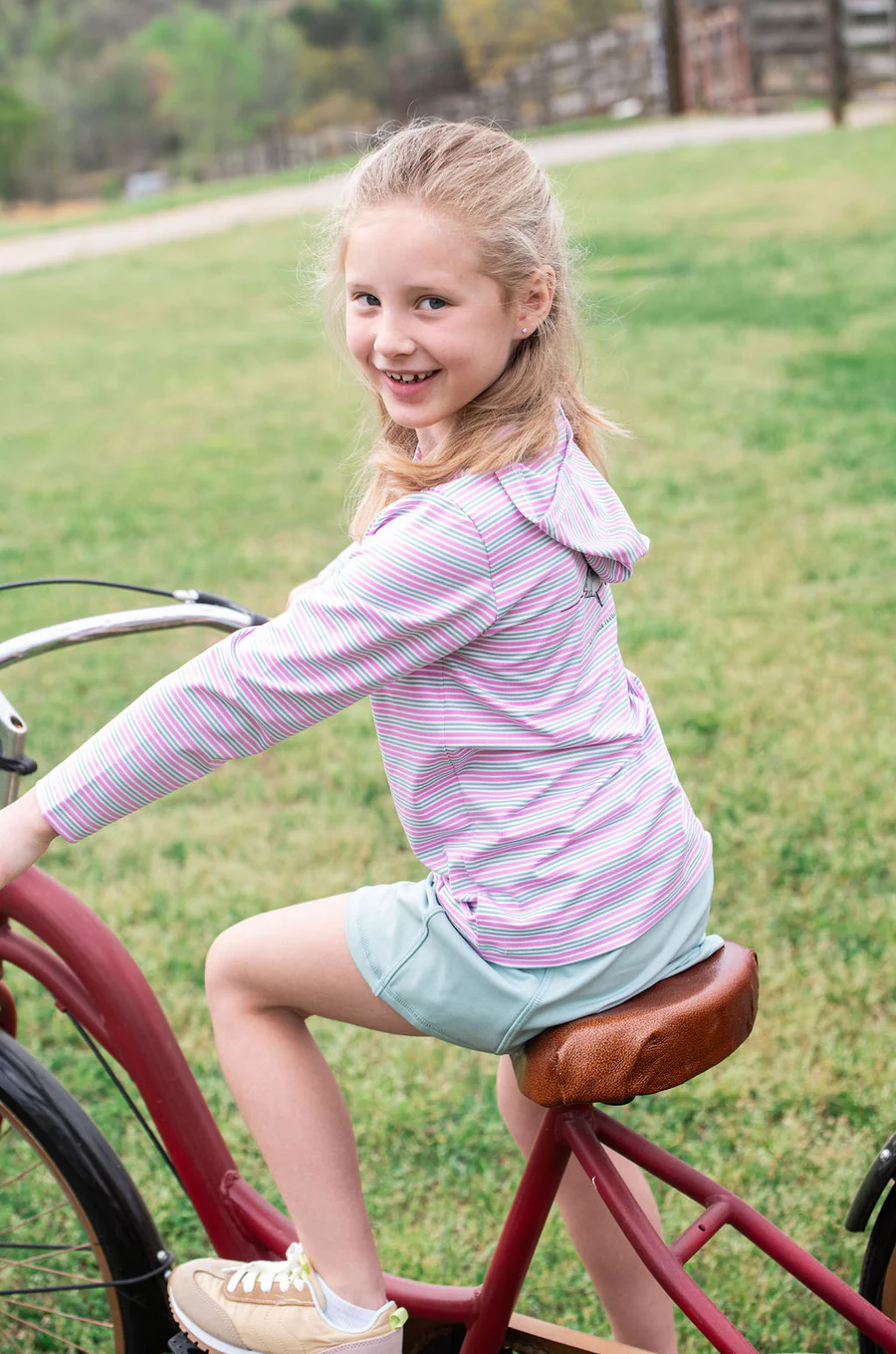 PRODOH Girl's Pro Performance Hoodie T-shirt in Pink and Green Stripe with Swordfish isn't just any hoodie—it's her go-to gear for all things outdoors. From fishing trips with Dad to beach walks with the fam, our Girls' Pink Stripe Performance Hoodie is built for big fun and serious sun protection. The lightweight fabric keeps her cool and dry (even after catching frogs or chasing waves), while the UPF 50+ rating gives you peace of mind under the sun. The custom stripe print in shades of lavender and blue surf is a showstopper. And that Swordfish on the back? Just the cherry on top of a brand that's all about outdoor traditions and full childhoods. Share your Outdoor Traditions with us!