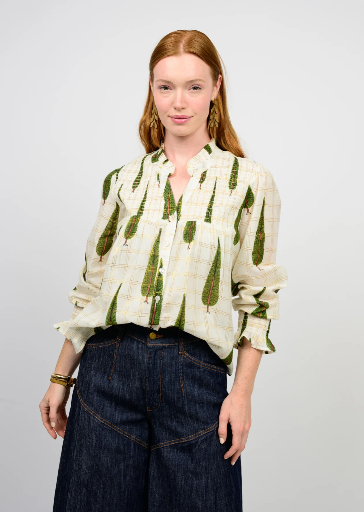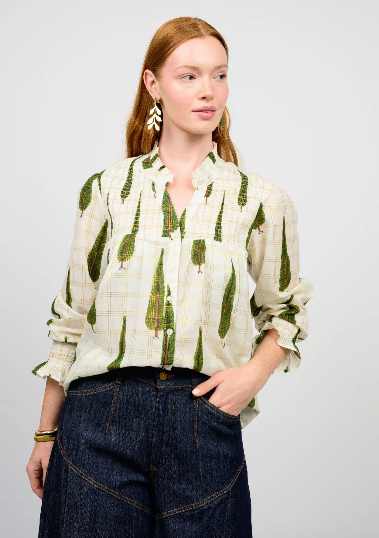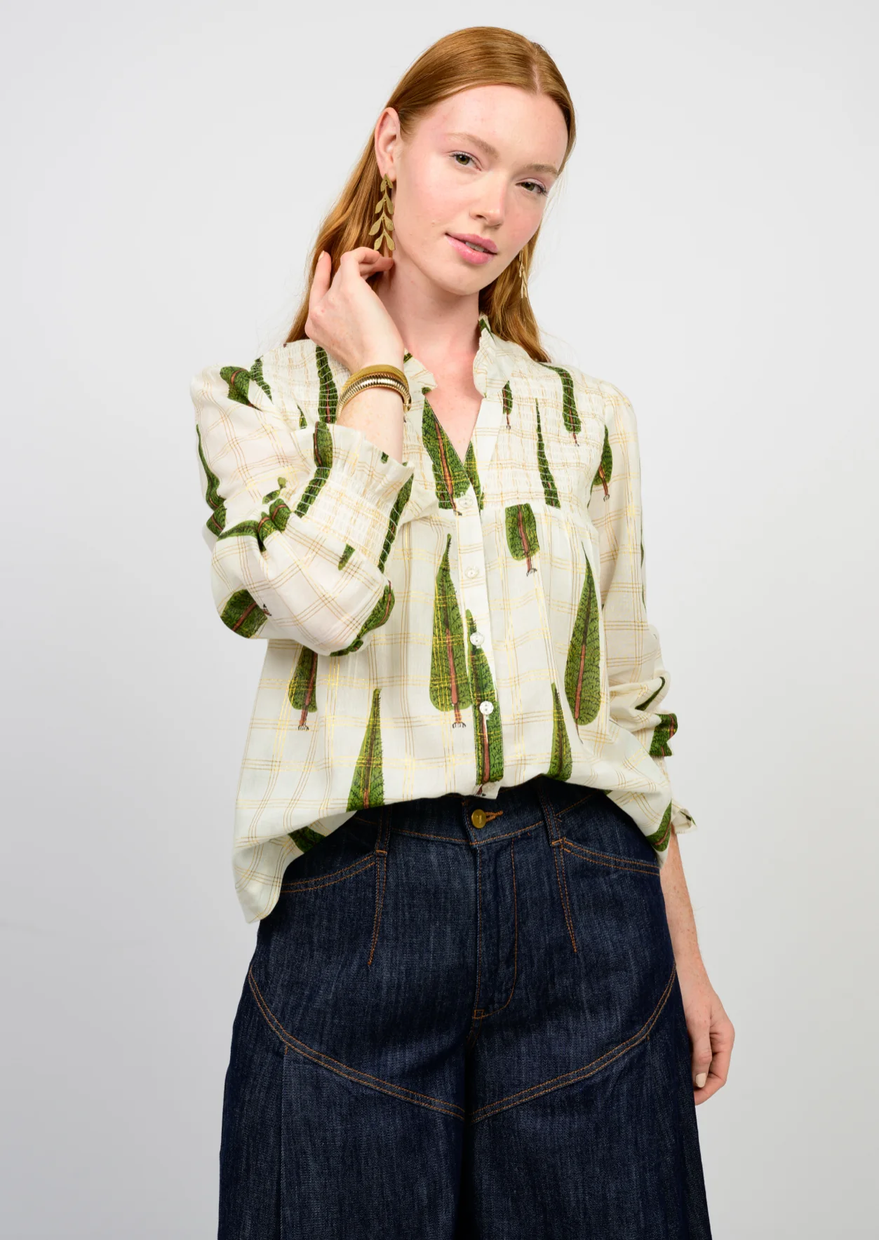 Features: Elastic Sleeve Cuff, Button Up Front, Smocking Above Bust