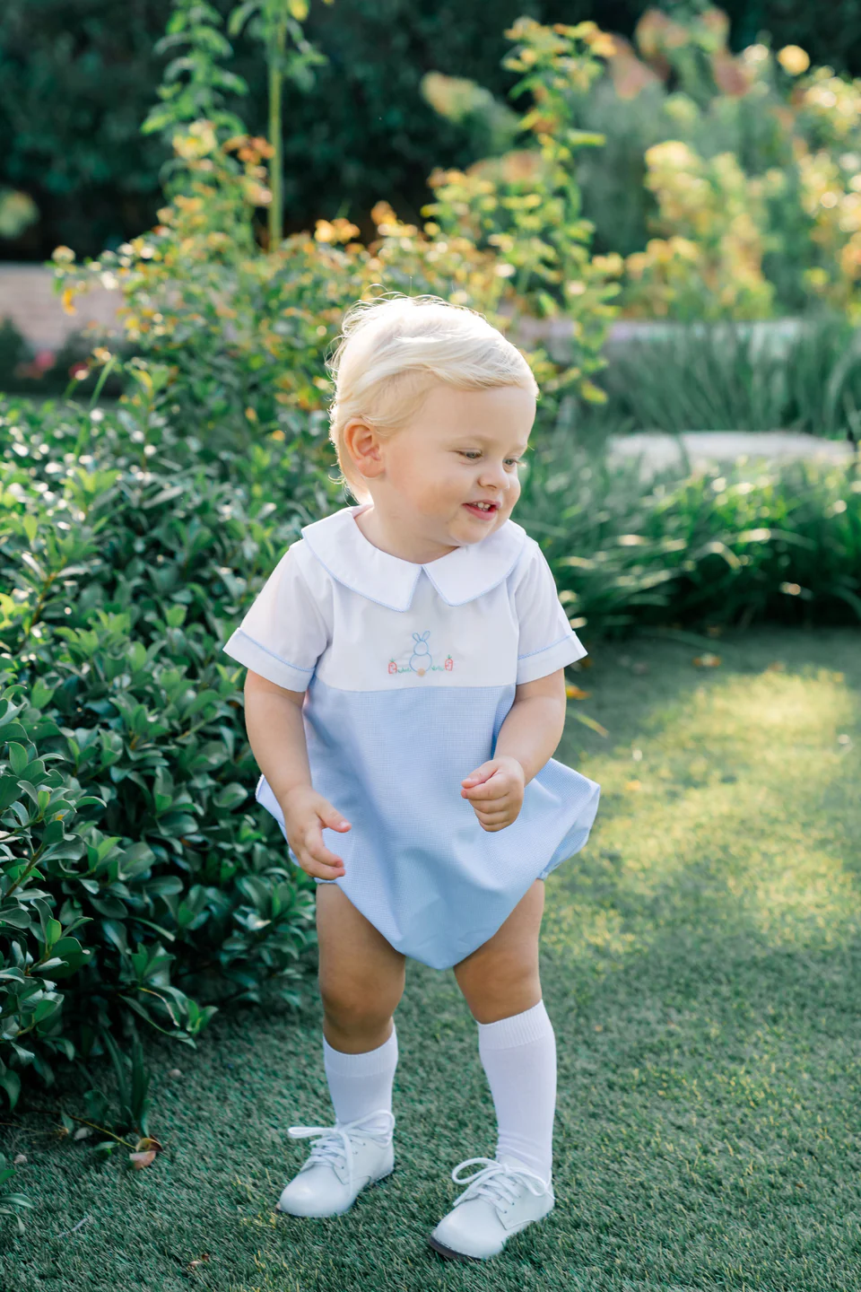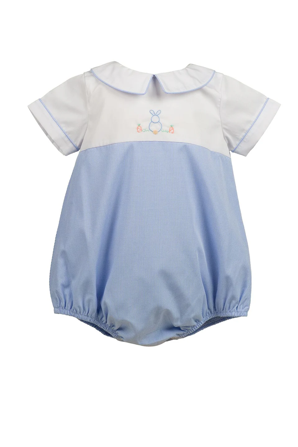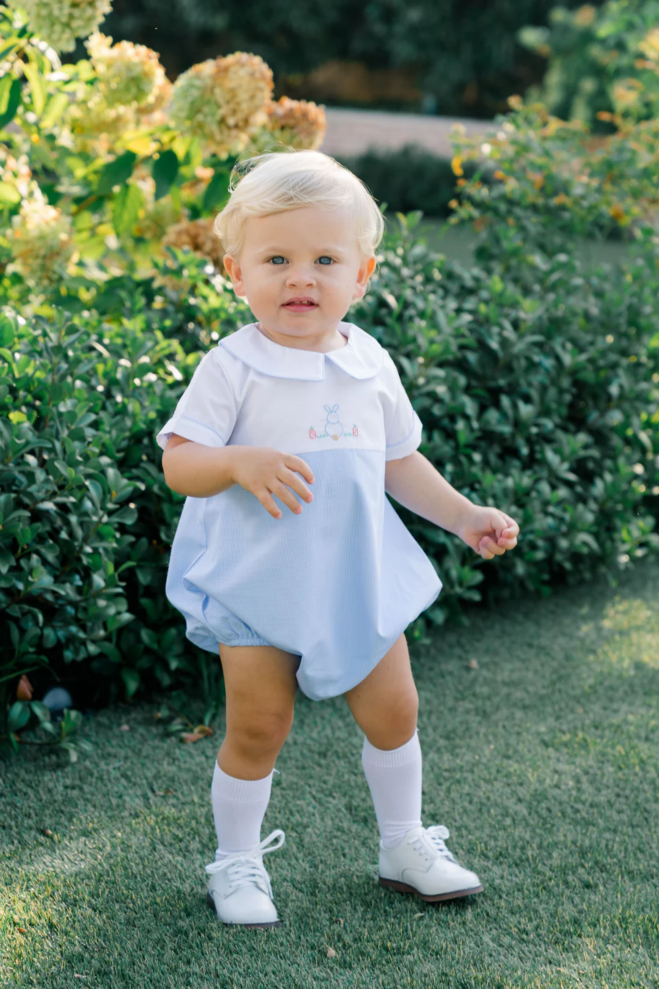 Be dressed and ready for the Easter season in our Clover Bunny collection! Soft blue and white with hand-embroidered bunny makes for the sweetest styles.