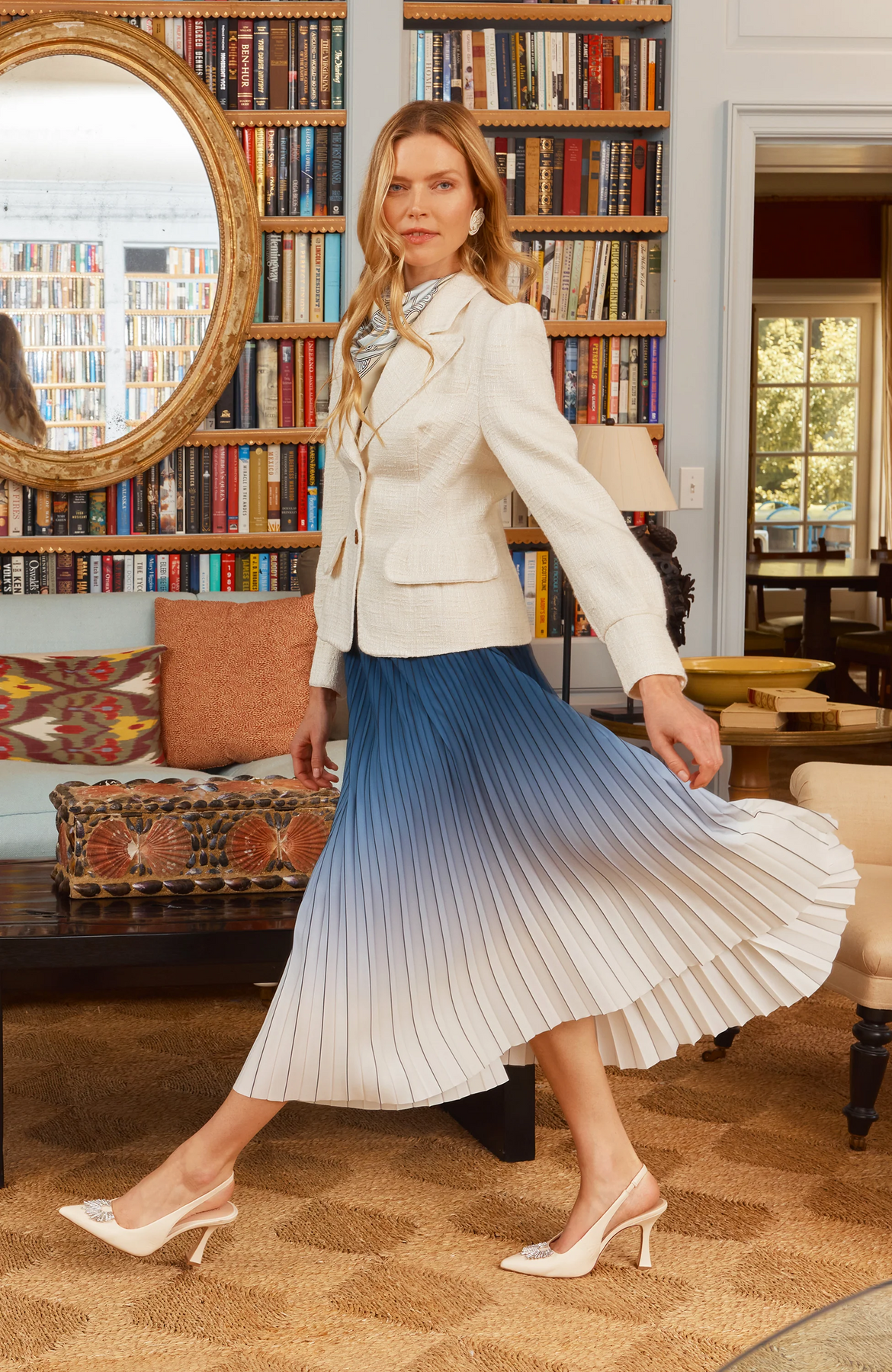 Featuring finely pressed pleats that create beautiful flow with every step, this skirt is elevated by its stunning ombré gradient—shifting seamlessly from deep navy to soft ivory. The design offers both modern artistry and timeless elegance, making it a versatile statement piece.