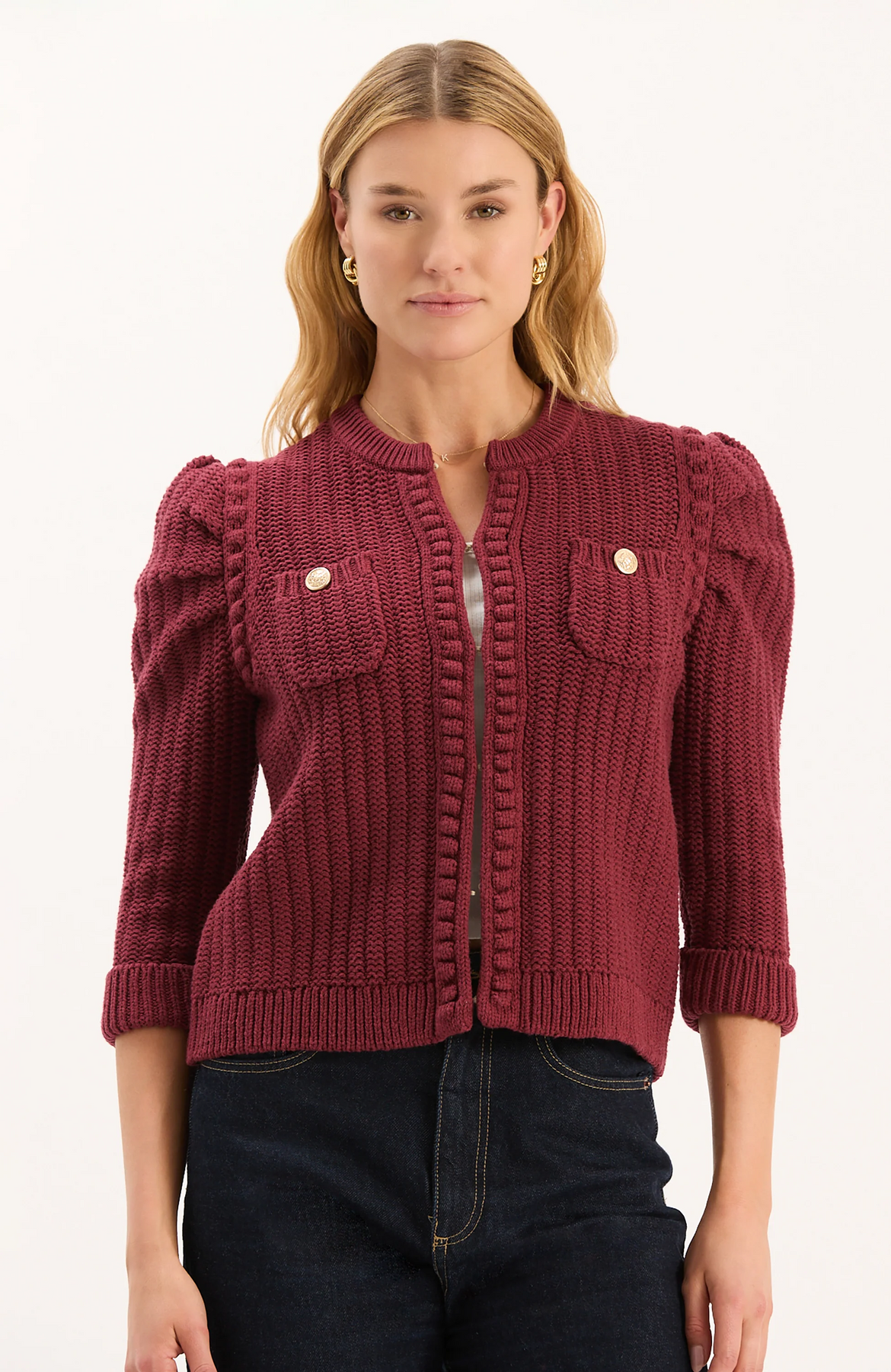 This cardigan can be worn like a little couture jacket that's revisited in knit. The cardigan has a slightly cropped shape, a round neckline and statement puffed shoulders. Elevated with gold buttons, this piece is easy to wear mid-season and layered as the weather gets colder.