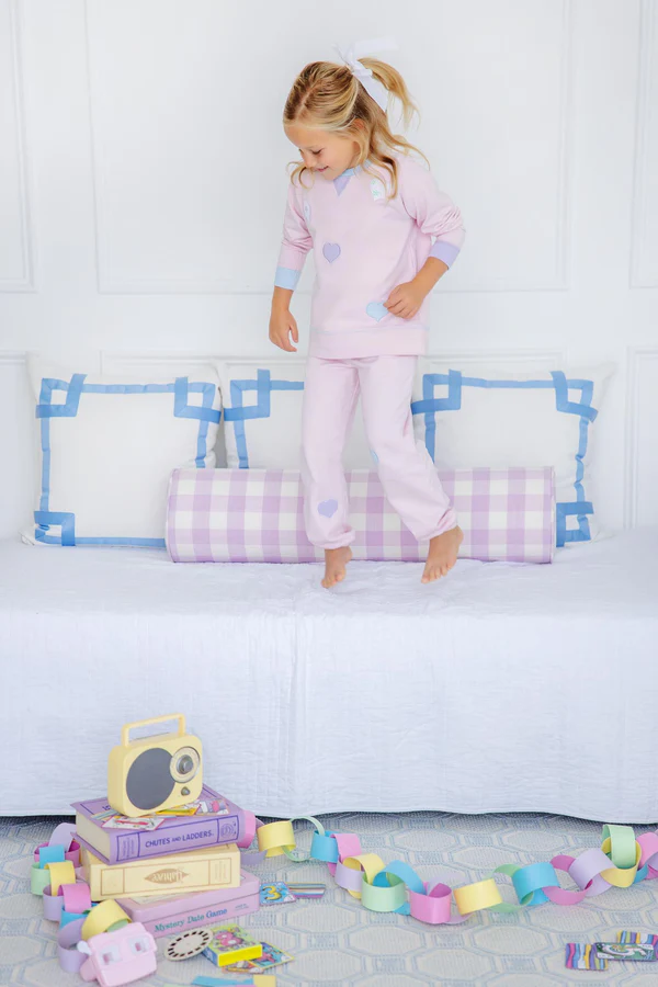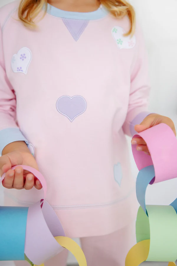 Fall in love with the Cassidy Comfy Crewneck in Palm Beach Pink! Featuring Buckhead Blue and Lauderdale Lavender hearts. this Cassidy will be her new favorite go-to piece for everything from playground adventures to family gatherings.