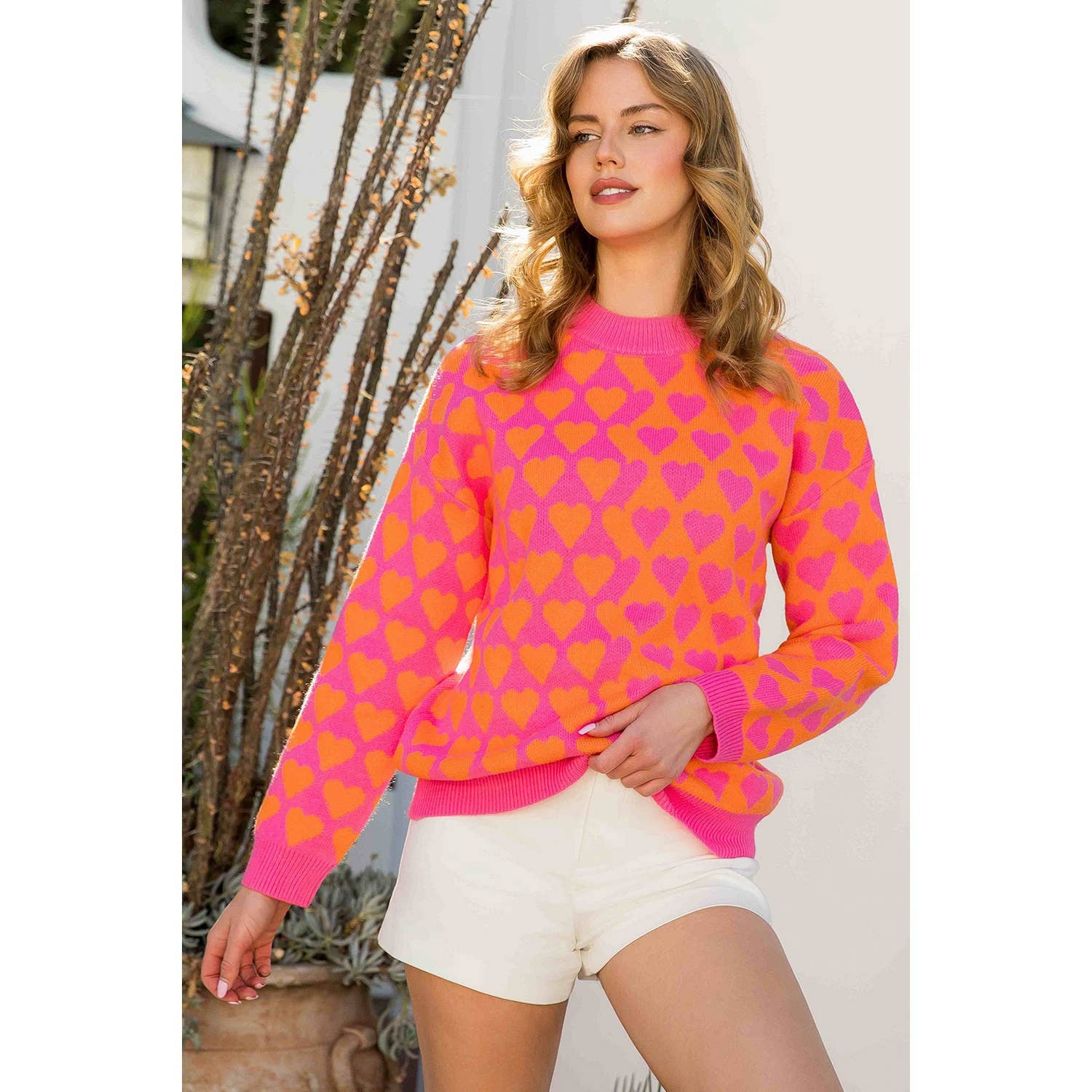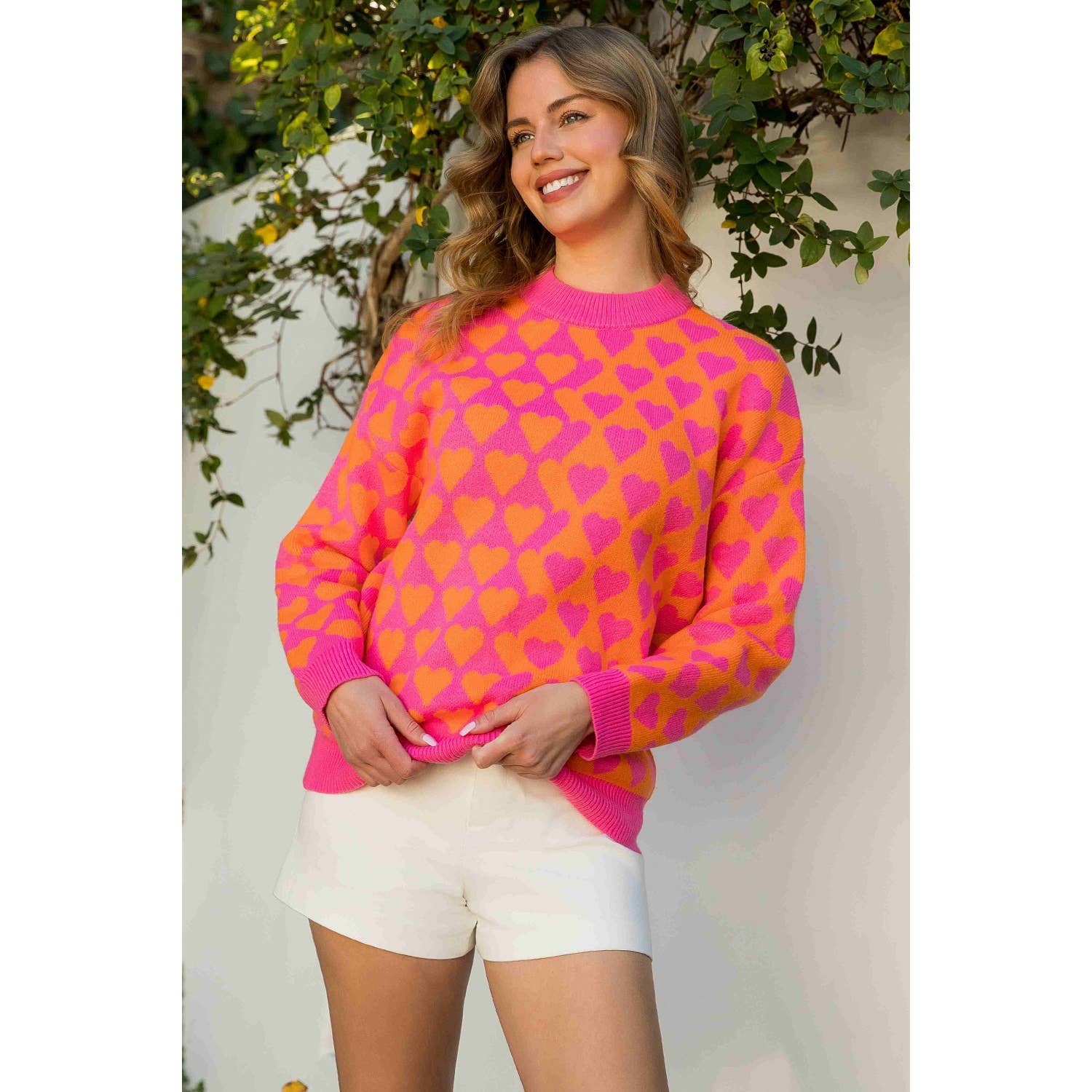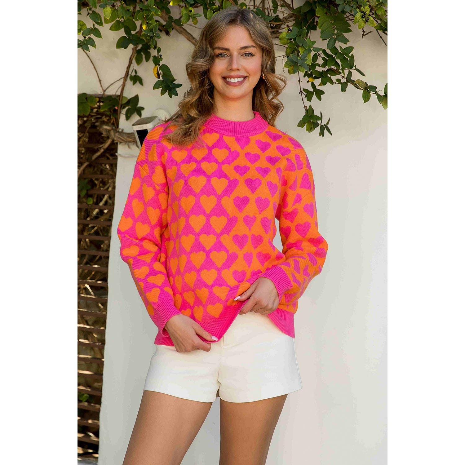 Heart Jacquard Long Sleeve Sweater . / Style Measurements for Size S / Designed in USA - Body Length: 24 1/4 in - Bust Width: 43 1/2 in - Sleeve Length: 19 3/4 in . / Model Sizes - Wearing Size S - Height 5' 9", Bust 32", Waist 25 1/2", Hips 36" . / Prepack Contents - In a Pack of XS(1), S(2), M(2), and L(1) per Color Only . / Fabric Content - KNIT / 50% Acrylic, 22% Nylon, 28% Polyester