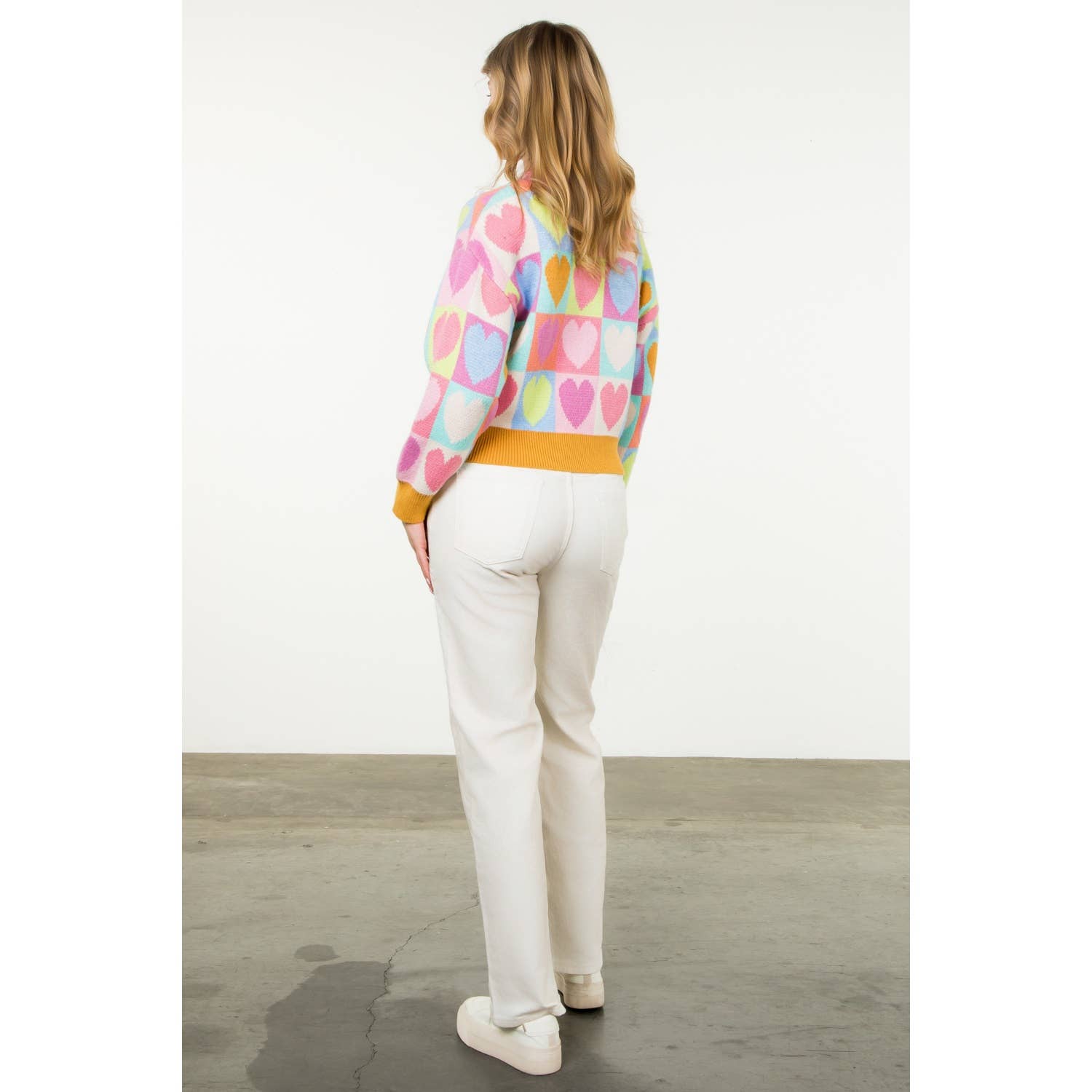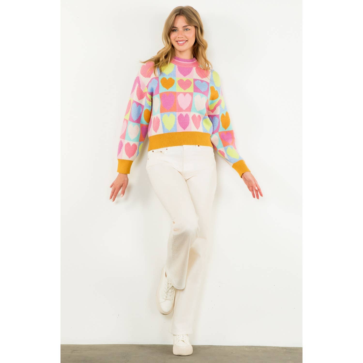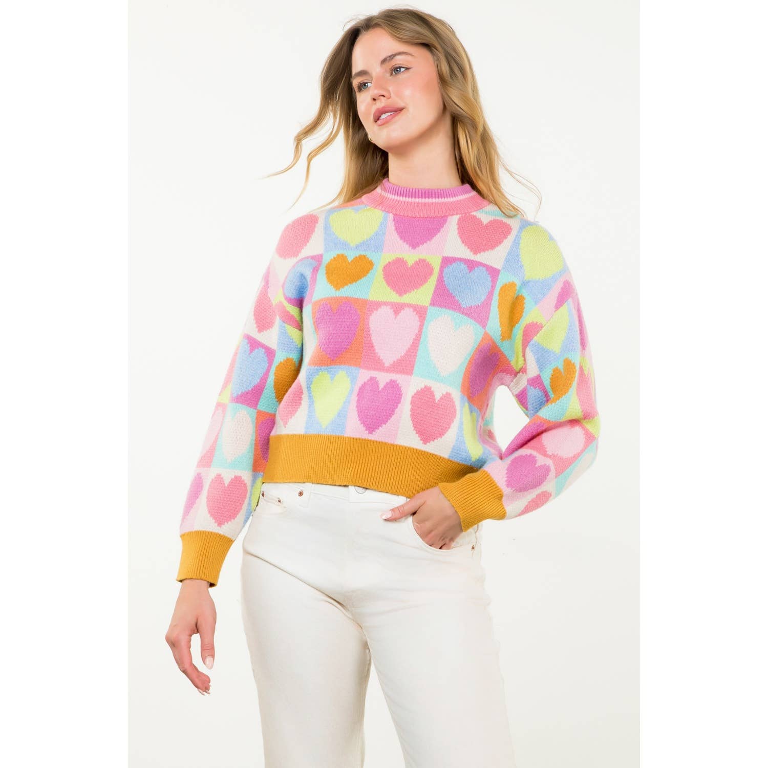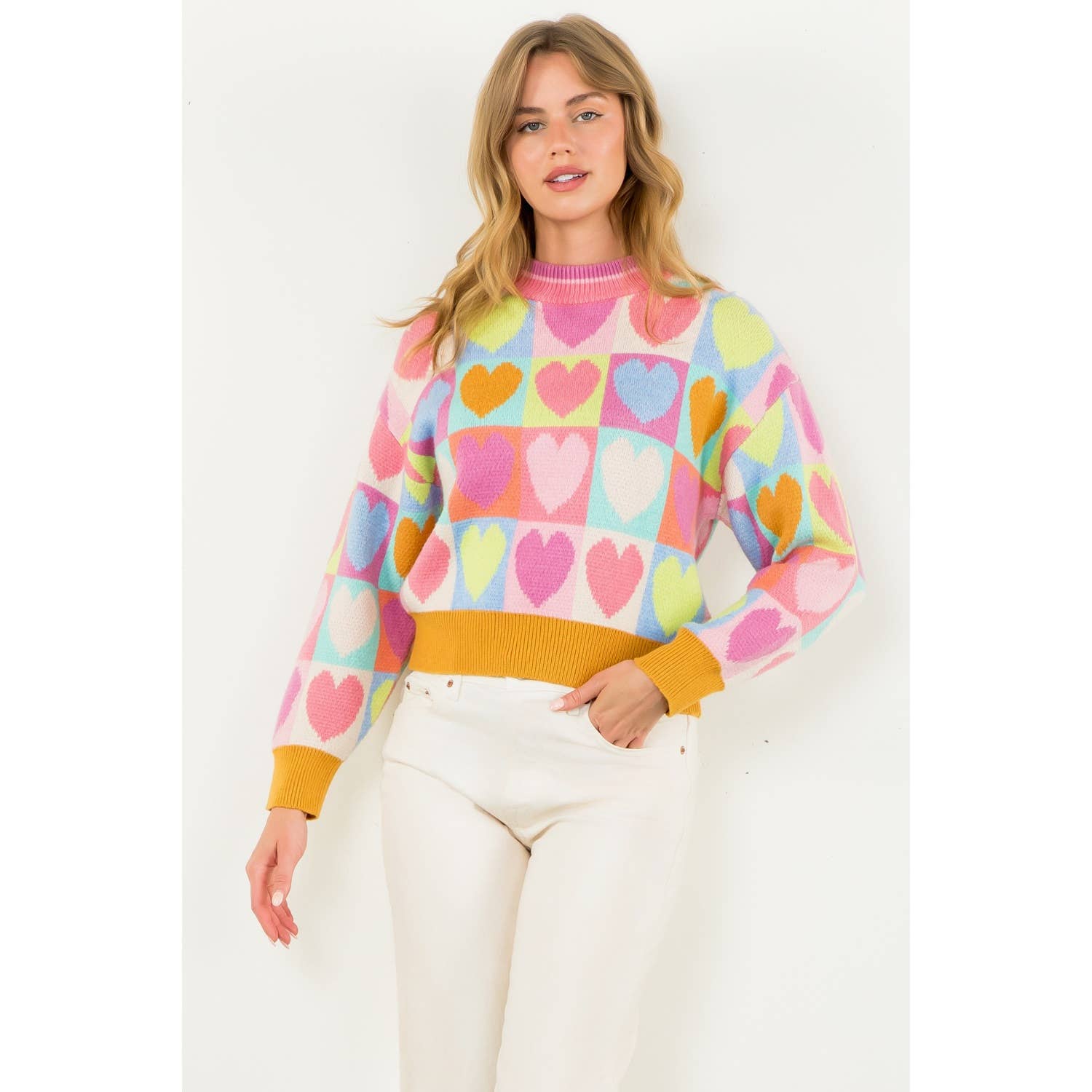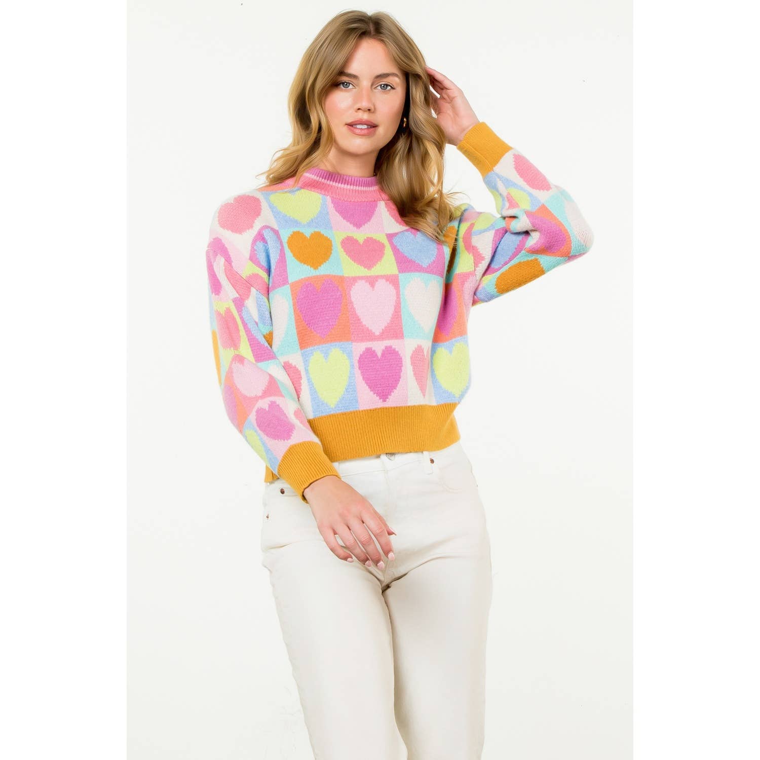 Mock Neck Heart Knit Sweater . / Style Measurements for Size S / Designed in USA - Body Length: 20 1/2 in - Bust Width: 39 in - Sleeve Length: 20 in . / Model Sizes - Wearing Size S - Height 5' 9", Bust 32", Waist 25 1/2", Hips 36" . / Prepack Contents - In a Pack of XS(1), S(2), M(2), and L(1) per Color Only . / Fabric Content - KNIT / 43% Viscose, 32% Nylon, 25% Polyester